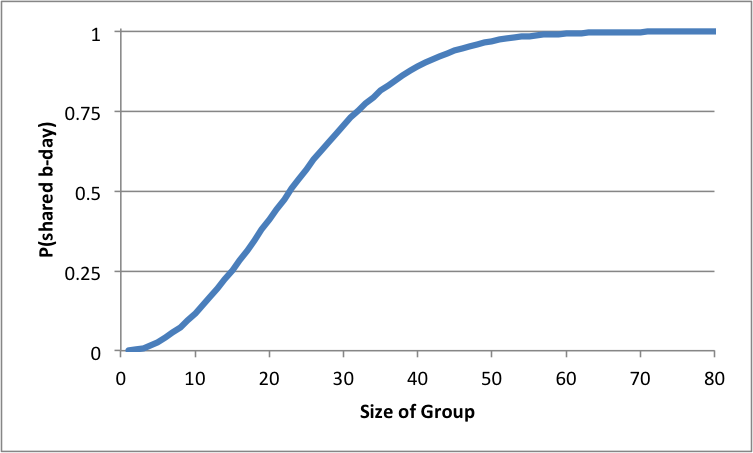 The plot at right shows the probability that at least one pair in a group has the same birthday for increasing group sizes. Surprisingly with a group of people as small as 23, it is even money whether some pair will have the same birthday. At a group of size 57, there is a 99% chance for a birthday collision! My probability teacher once suggested that this is an amusing property to try out at parties. (Of course, I’m guessing that means my math teacher wasn’t invited to many parties.)