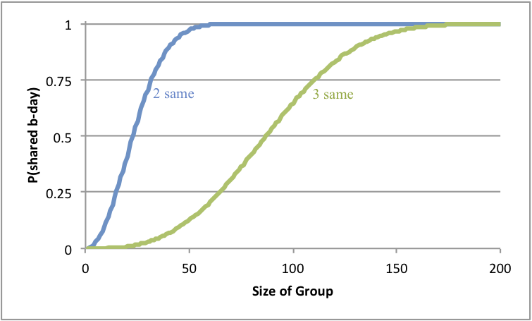 So what is the probability for, given a group of people, that three have the same birthday? The answer is… I don’t know. The trick I used for a pair of people doesn’t work for 3, and the counting just gets too complicated for my little brain.
