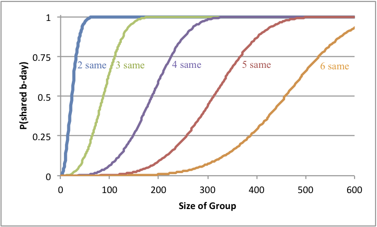 Here is a report of how likely it is to have up to six simultaneous birthdays. (The full data for this plot are posted here.) As we increase the number of simultaneous birthdays, we need a larger group size to make it probable. (No surprise there.) Also note that the behaviors of these curves are similar. They all start off unlikely and then the curve dramatically bends upward.