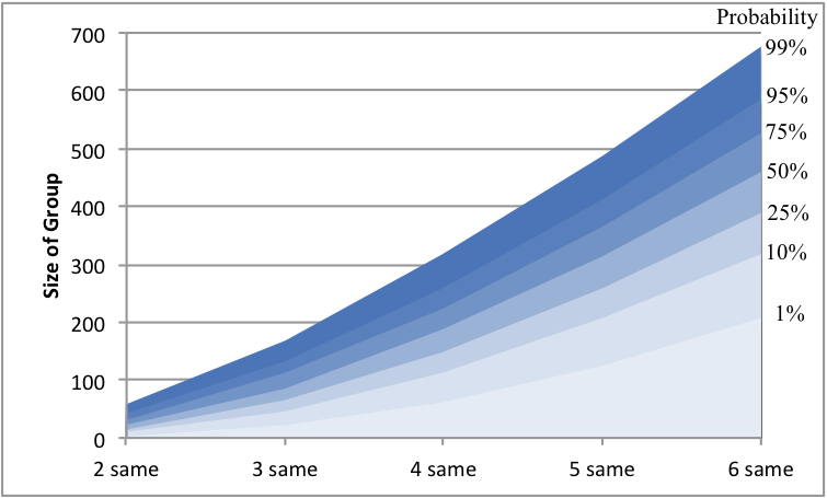 This next plot demonstrates the trend of the N birthday problem. The plot shows the size of the group necessary to hit a particular probability for each version of the birthday problem. At the top of the filled lines is the group size for a 99% probability, which I take for almost certainty.