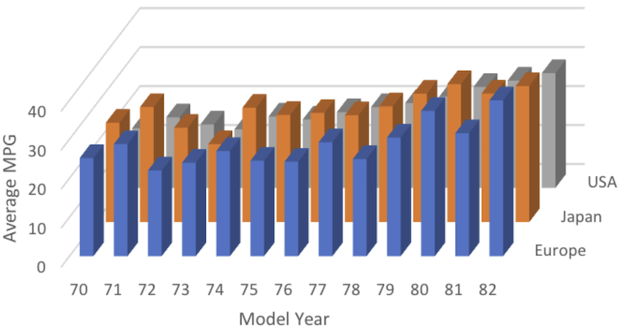 Consequently, I recommend staying away from 3D charts as much as possible. Take for example this chart that uses 3D to show the trend of the average MPG of vehicles for each year divided by the origin of manufacture. It makes use of the extra dimension to space out the data, but the 3D projection makes it difficult to compare values. The upward trend is much less noticeable; a comparison of like entries for different origins is near impossible, and some of the bars are completely obscured by other ones.