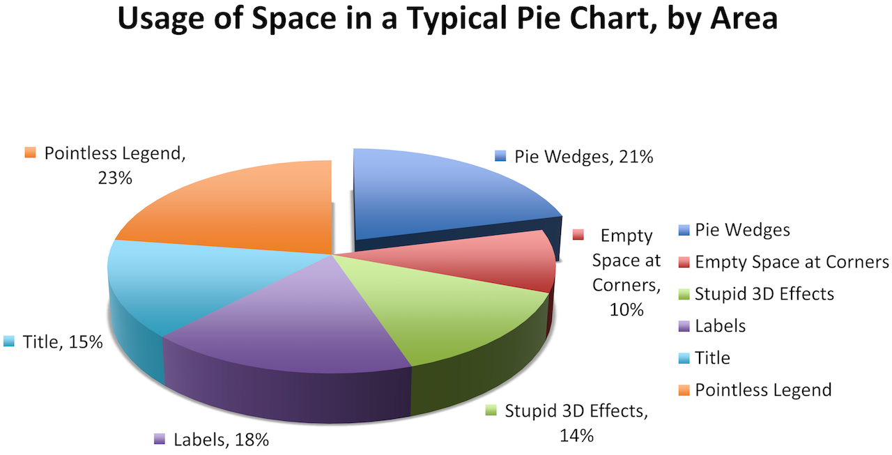 However, I recommend never using pie charts. As a form of visual display, they are quite terrible. The problem is that people are not that good at comparing relative angles, especially when they are rotated with respect to one another.
