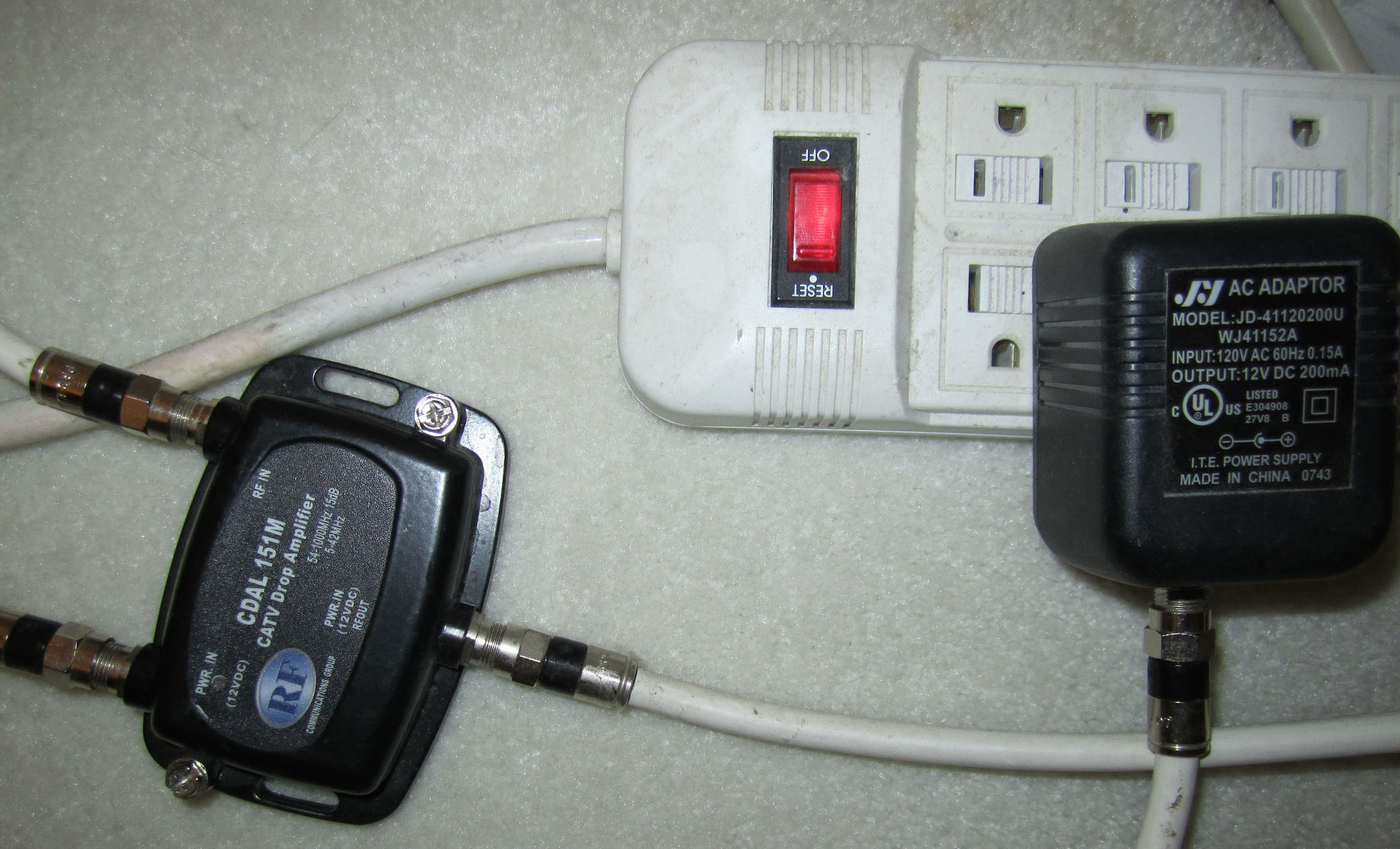 As you trace the cables through your house, you may encounter other equipment that is not a splitter. For example, in my house near the den TV there was an amplifier installed in the line (shown to the right). Equipment like this is problematic because it is usually not designed to let network signals pass through in both directions.