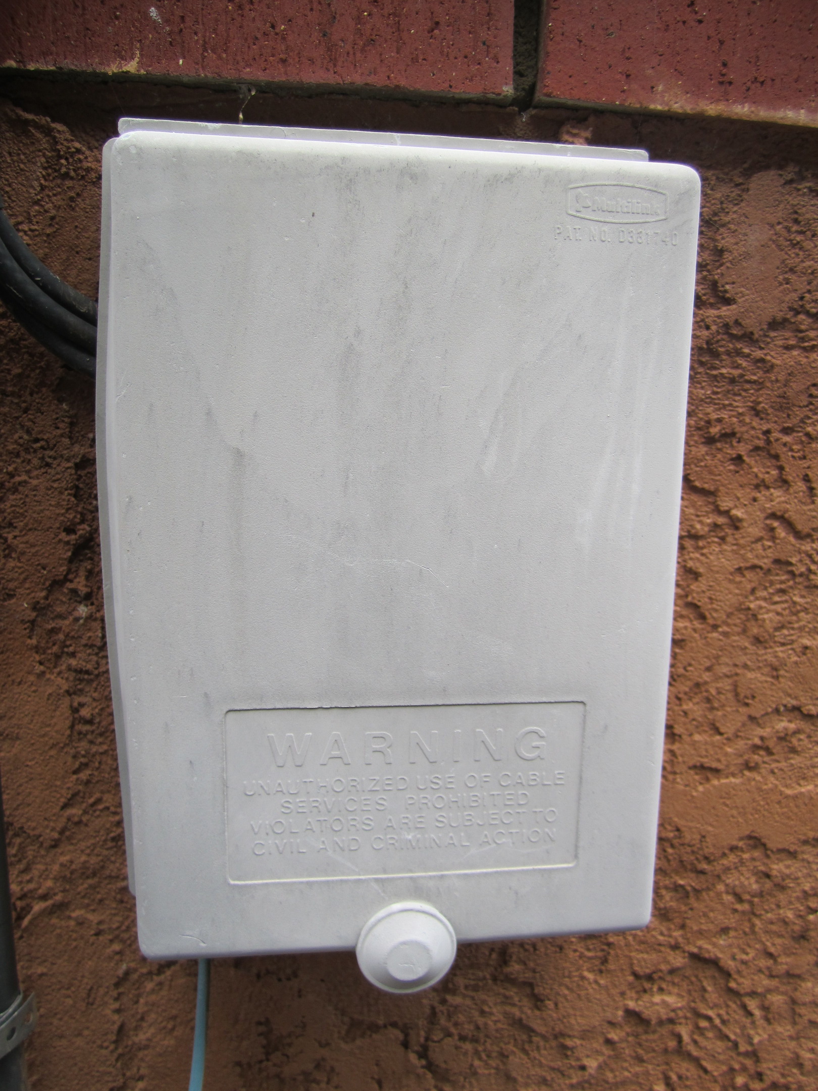 The typical cable installation in a house is to have a single line coming into the house, which is eventually distributed among the rooms in the house. This place where the cable comes into your house, typically either from a buried cable or line running from a utility pole, is called the “point of entry.” Typically the point of entry is in a plastic utility box mounted to the side of the building. At right is a picture of the box mounted to the side of my house.