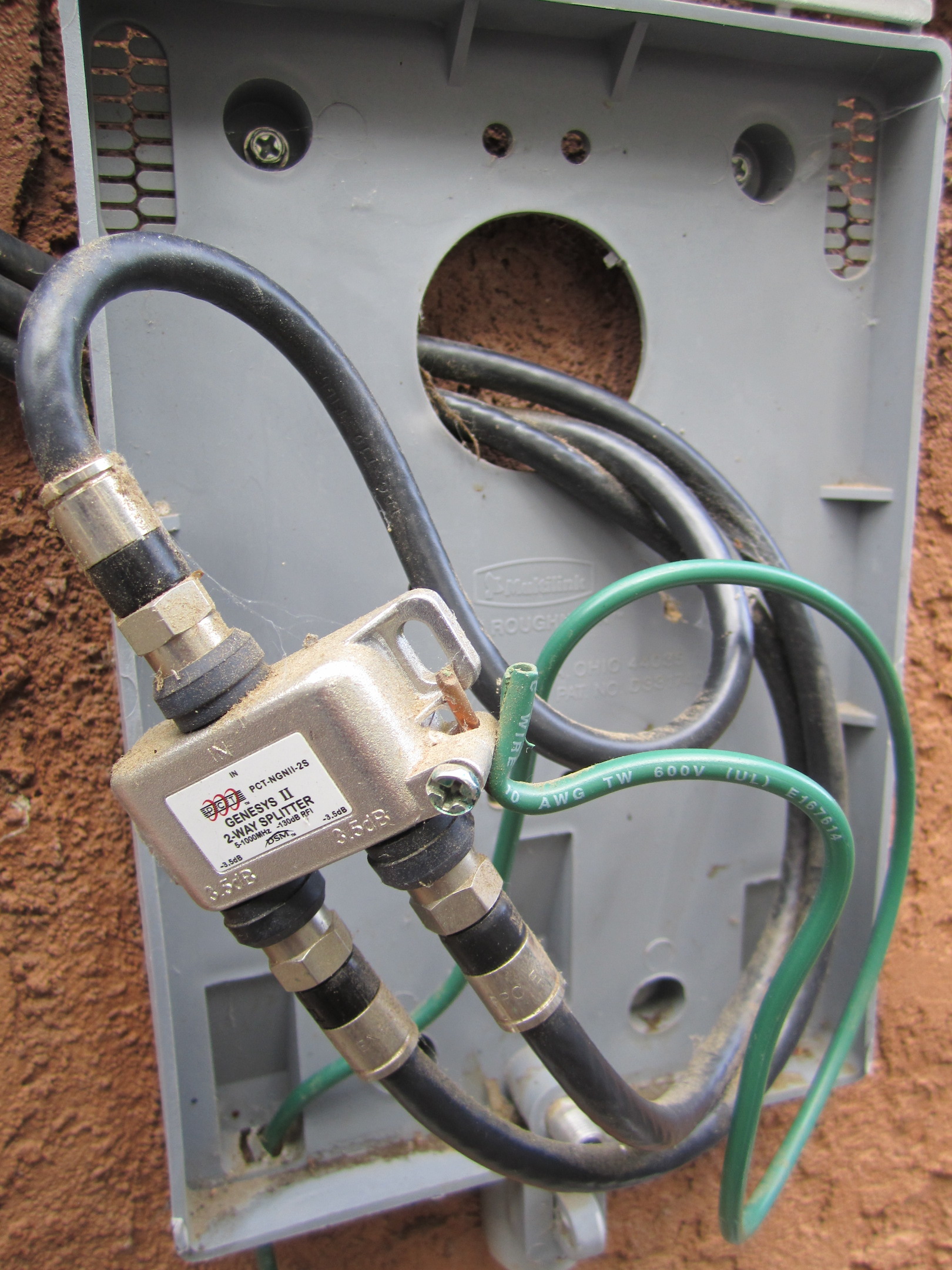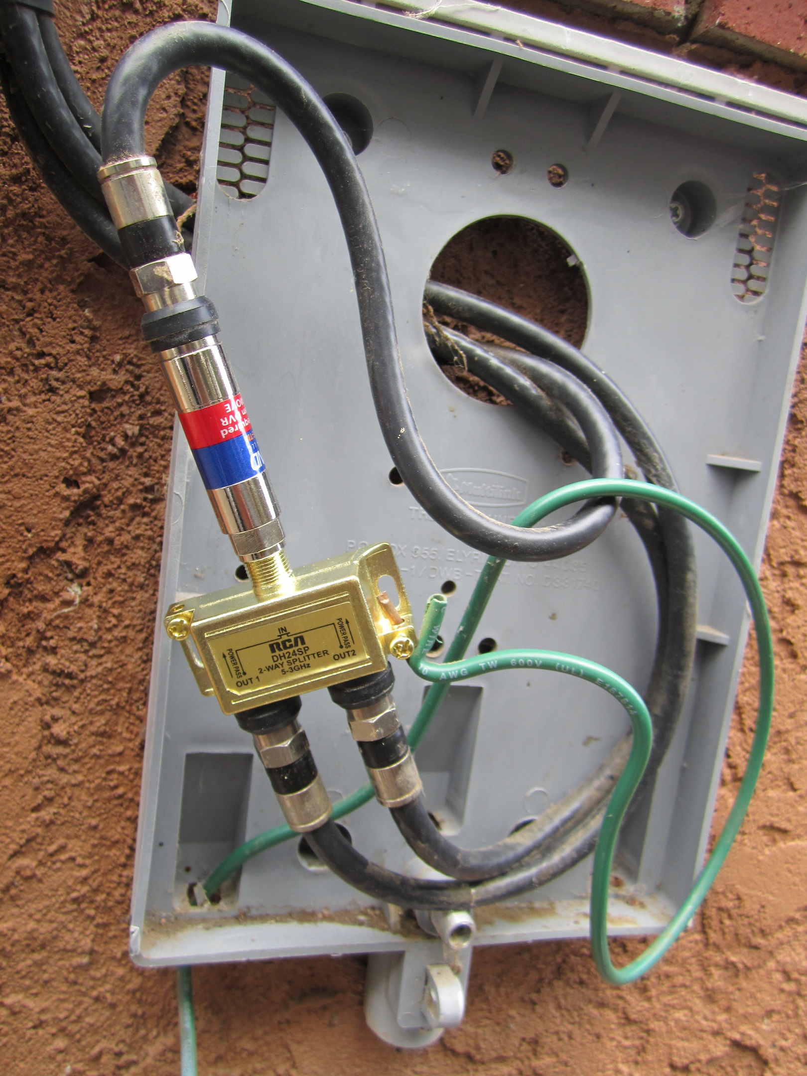 If you have identified your point of entry as one of these utility boxes, it is a good idea to open it up and have a look inside. Now, I know that opening up utility boxes can be scary, and for some utility boxes, like a circuit breaker box, it can be downright dangerous. But as you can see from the picture of the inside of my box at left, a cable utility box typically just contains some coaxial cables and a splitter, which is the same stuff you might use to hook up your entertainment center. (Let it be stated though, that you perform this and any other actions at your own risk. I do not take any responsibility for harm to yourself or equipment.)
